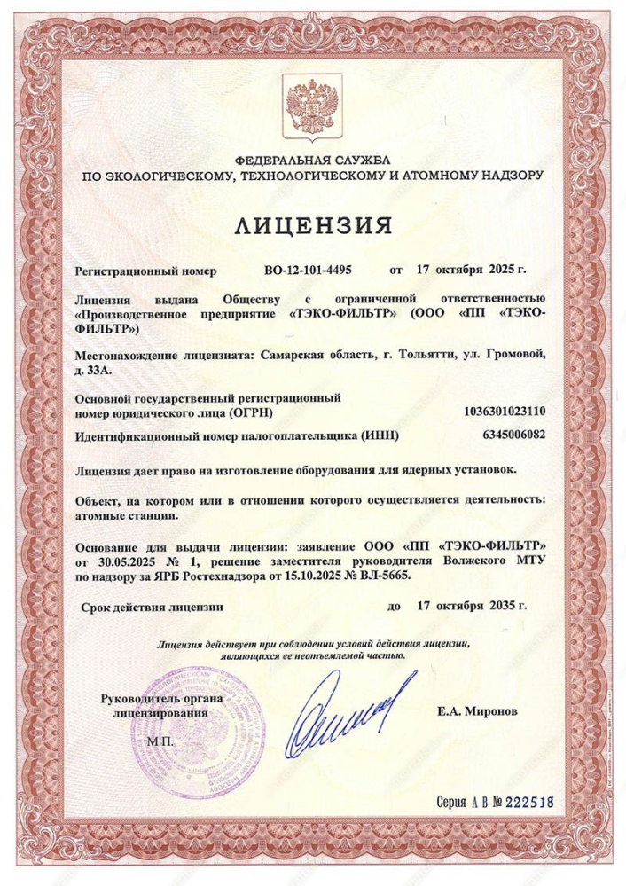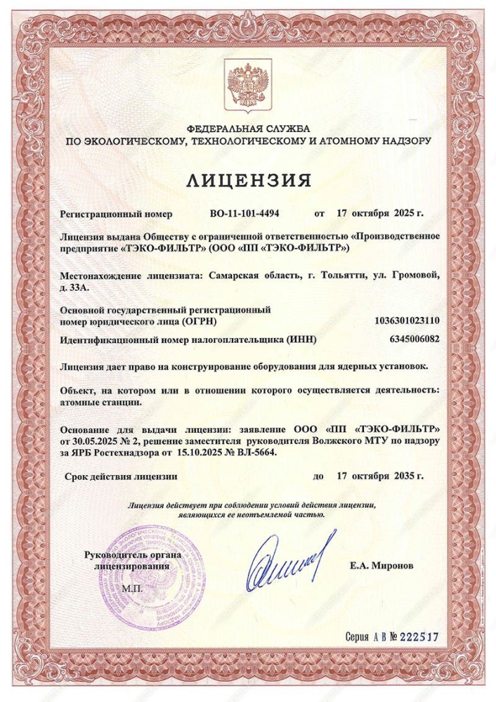Производственное Предприятие ”ТЭКО-ФИЛЬТР” успешно прошло переаттестацию и продлило действие двух лицензий Федеральной службы по экологическому, технологическому и атомному надзору (Ростехнадзор) на проектирование и изготовление оборудования для атомных электростанций. Новый срок действия лицензий — 10 лет.